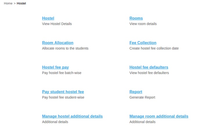 The Hostel plugin is designed to handle and manage all activities related to running an efficient hostel in your institution. You can record details about your hostels such as hostel room information as well as manage room allocations.