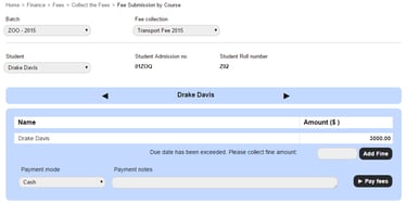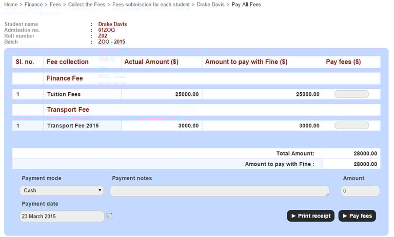You can collect and process all types of student fees, such as Finance fee, Transport fee, and Hostel fee right from the Finance module.