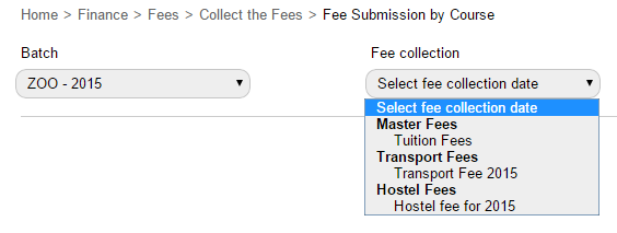 Select a batch and a fee collection. You will notice that all types of fee collections scheduled will be displayed as depicted in Fig 1.