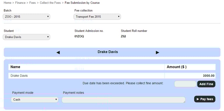 At the top of your dashboard, click the module access icon > Administration > Finance > Fees > Collect the Fees > Fee submission for each student.