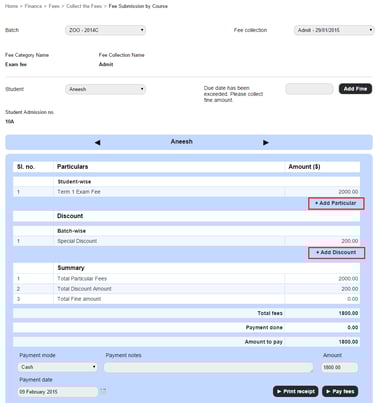 Yes, when collecting fees from a student through the Finance module, you can create an instant fee particular or an instant fee discount. You can collect fees: