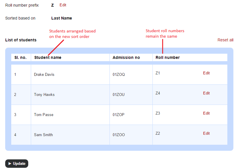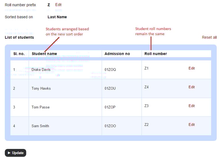 Yes. The student sort order can be changed at any time. If you change the student sort order after assigning student roll numbers, all students will be arranged based on the new sort order. However, the assigned roll numbers will remain the same.