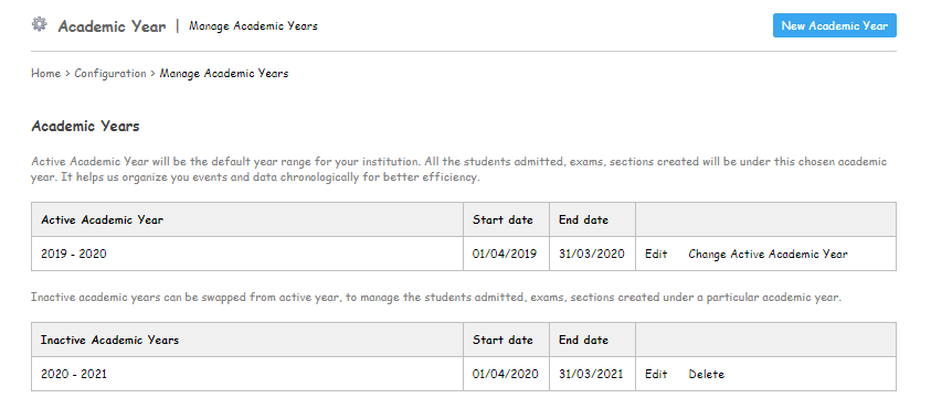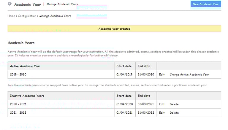 Click on the New Academic Year button to create a new academic year.