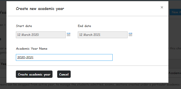 Enter the details of Start Date, End Date, and Academic Year Name to create the academic year.