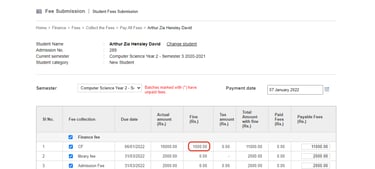 Here the fine for each day will be calculated based on the principal amount/pending amount, that is, excluding the fine. Also, when a student pays an amount, it will be deducted from the principal amount only. The calculated fine on each day will be added to the existing fine, this value will be kept separate throughout until the principal amount is paid. The fine calculation will stop once the principal amount/pending amount is 0.