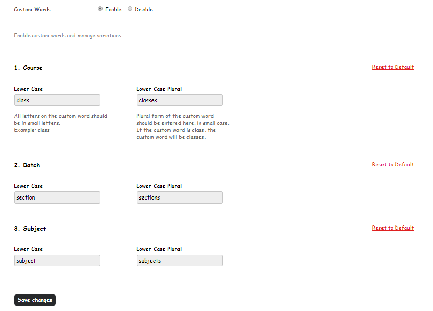 The user needs to enter the Lower Case and Lower Case Plural for creating the custom words.
