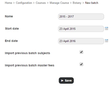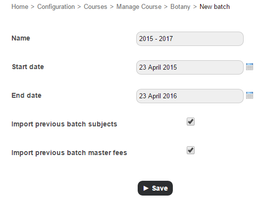 Select the Import previous batch master fees checkbox to assign the previous batch fees structures (fee categories and fee particulars) to this batch.