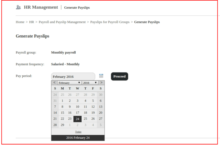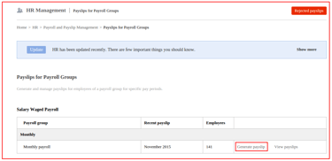 Each payroll group must be processed separately for a specific pay period. Employee payslips can only be generated once for a pay period. For example, if the payment frequency of a payroll group is ‘Monthly’, payslip generation for the employees assigned to the payroll group can only be done once every month.
