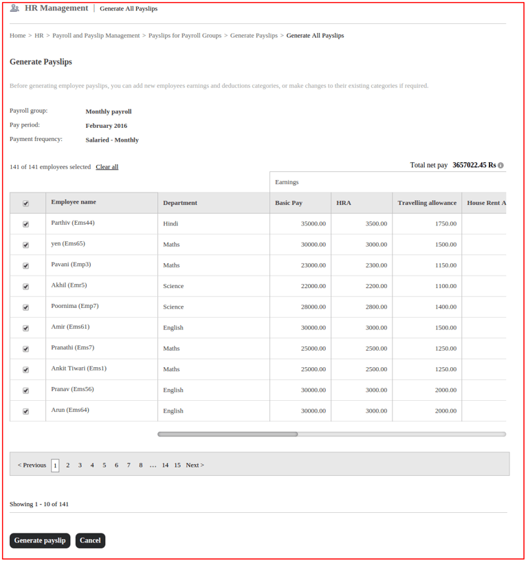 Payslip can be generated for an employee through Payslip for Employee or to a set of employees through payroll groups.