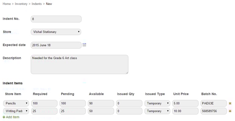 A Privileged Employee can raise indents, requesting for items that may be required by the employee or by a department. After an indent is raised, the indent is sent to the employee’s manager for approval.