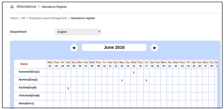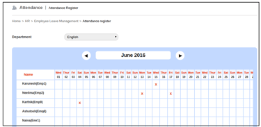 View the attendance details for all employees of a department. When an employee applies for leave through the Leave Request feature and is approved by the manager, the employee’s attendance register will display an ‘X’ against the name of the employee for that particular date(s).