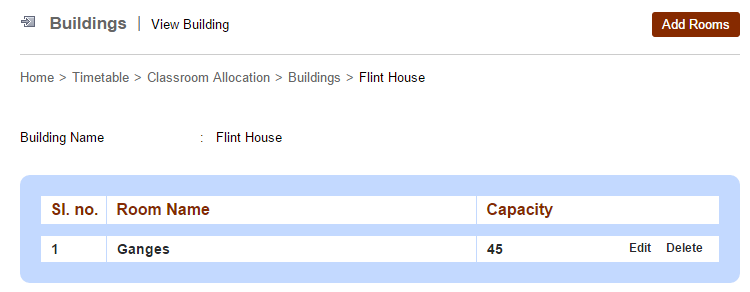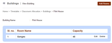 At the top of your dashboard, click the module access icon > Academics > Timetable > Class Room Allocation > Manage Buildings to open the Manage Buildings page.