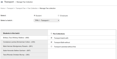 3. Click on student name, select the fee collections which are to be assigned to that particular student.