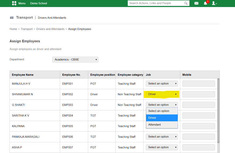 Step 3: Select the employee and change 'Job' field to Driver or Attendant as shown below and 'Save'