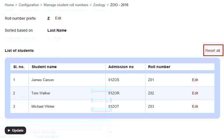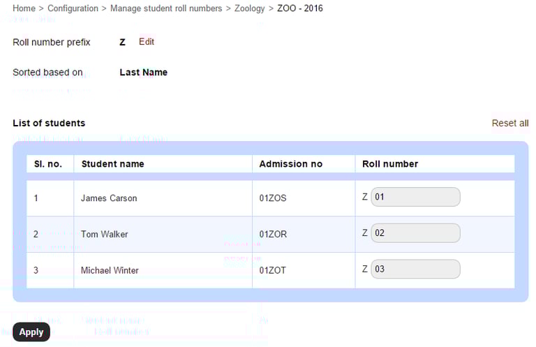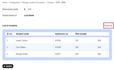 5. You can reset the roll numbers to the default set at any time by clicking Reset all.