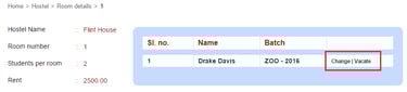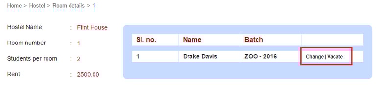 To vacate the student from a room, click Vacate beside the student and then click Ok.