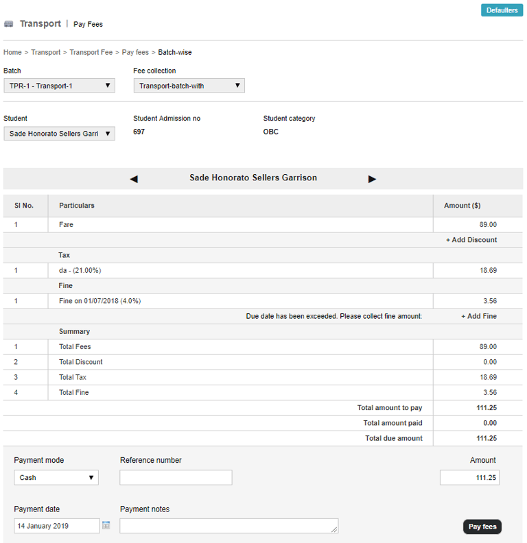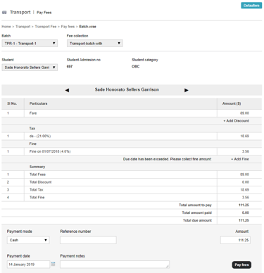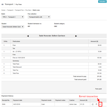 When collecting and processing transport fees for each batch of students, a full payment transaction must be created. You cannot create a partial fee payment transaction.