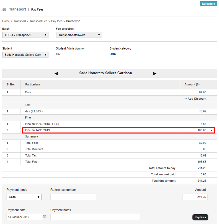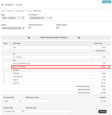 If the due date for the fee collection has passed, enter the applicable fine amount and then click the Add fine button.