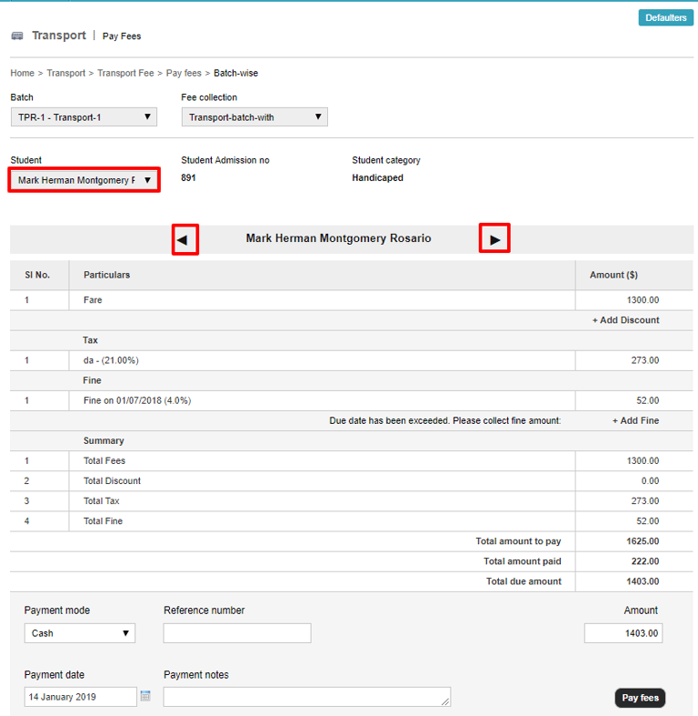 To collect and process the transport fees for another student in the batch, you can select the students in the top left or use the arrow icons to navigate to the next student record and then collect the fees.