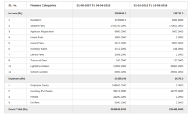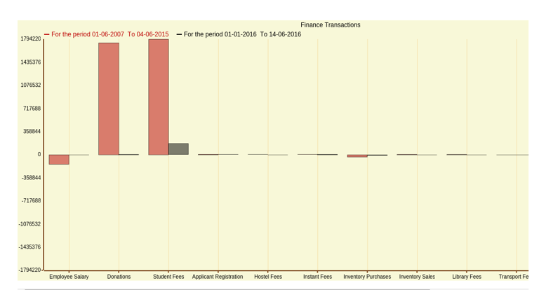 Below given report shows graphical representation comparing both the financial periods, displayed along with finance categories along the x-axis and income/expense amounts along the y-axis.