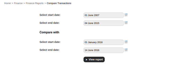 At the top of your dashboard, click the module access icon > Administration > Finance > Finance Reports > Compare Transactions.