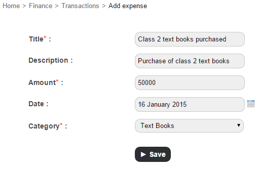 Expenses incurred by the institution can be recorded in the Finance module.