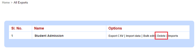Click Delete to perform the deletion of export in custom import..