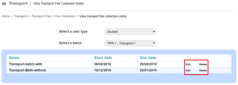 Click Edit to edit the fee collection dates, or click Delete to delete a fee collection.