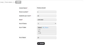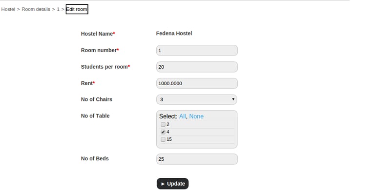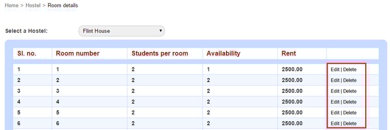 Click Edit to edit hostel room details or click Delete to delete a hostel room.