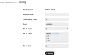 Hostel room details can be edited at any time, however, a hostel room can be deleted only if students have not been allocated to it.