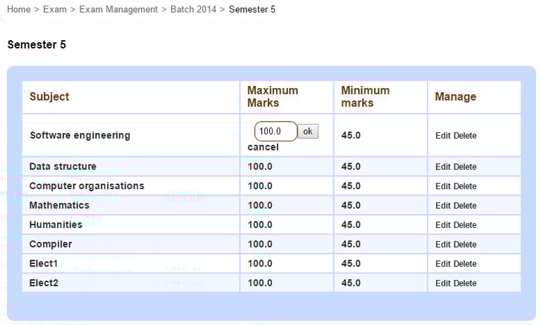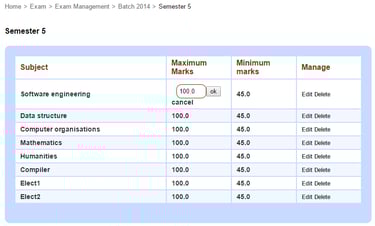 To edit the maximum and minimum marks for a subject, click on the marks and then edit, or click Edit beside the subject.