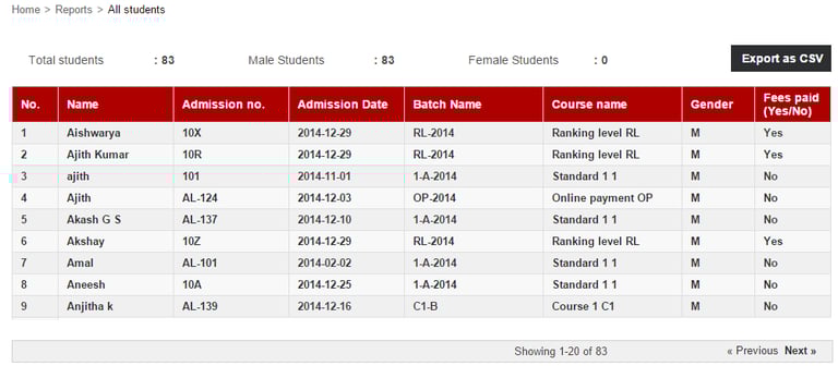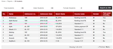 By clicking on Student all the active students will be displayed together with their admission number, admission date, batch, course, gender, and fee payment status.