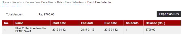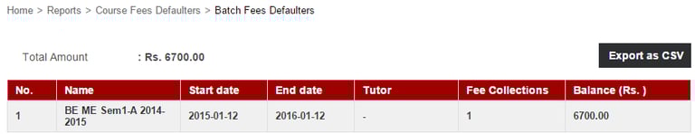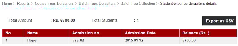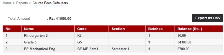 The Fee Defaulter Details report lists all the courses and the balance fees that needs to be collected from each course.