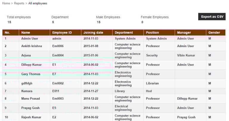 Click on Employee which will list all the active employees along with their joining date, department, employee position, current manager, and gender.