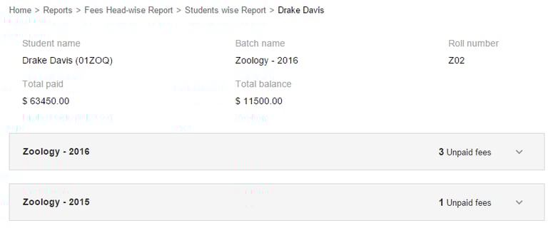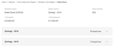 The Student-wise Report displays all the fees that a student has paid and is due to pay in the current batch as well as previous batches. The following types of fees may be listed: