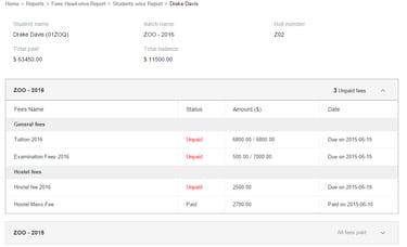 In the top right, click the PDF report button to generate a PDF report of the student’s fee payment details, or click the CSV report button to generate a CSV report of the student’s fee payment details.