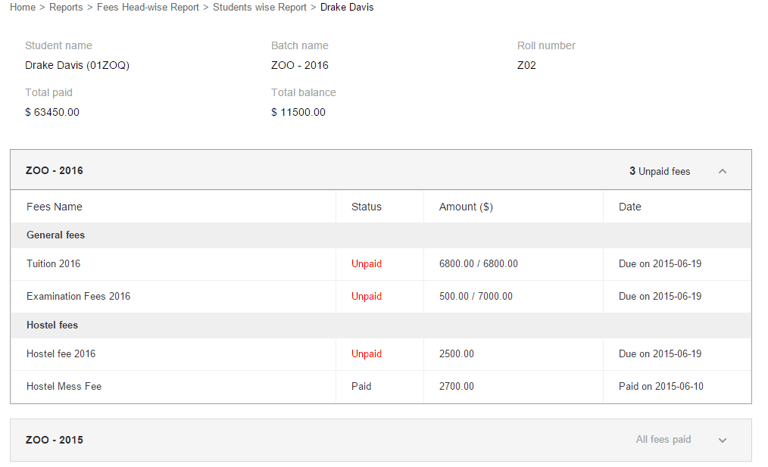 Click to expand and view all the fee details. The fee details include the fee name, payment status (Paid or Unpaid), amount paid or amount due, and payment date or payment due date. You can click on the fee name to go to the fee submission page and the process for fee payment for any unpaid fees.