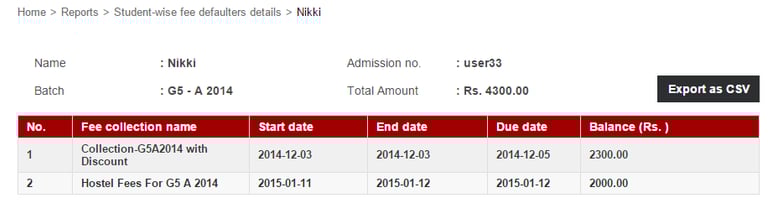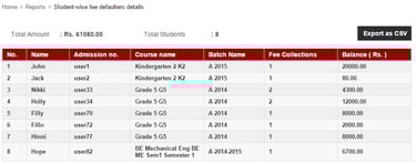 The Students Fees Defaulters Details report lists all the students who have not paid a particular fee collection. If an employee is provided the View Additional Reports privilege or the Finance Reports privilege, the employee can access the report through the Reports module – Click the module access icon > Data and Reports > Reports > Students Fees Defaulters Details.