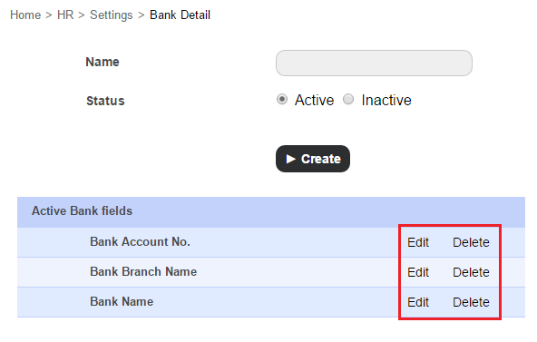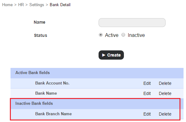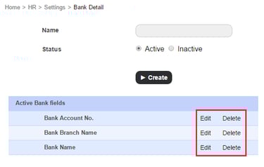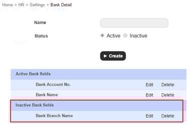 If you do not want a bank detail field to be displayed in the employee admission form, you can inactivate it or delete it. However, you cannot delete a custom bank detail field that has already been used to record employee bank details.