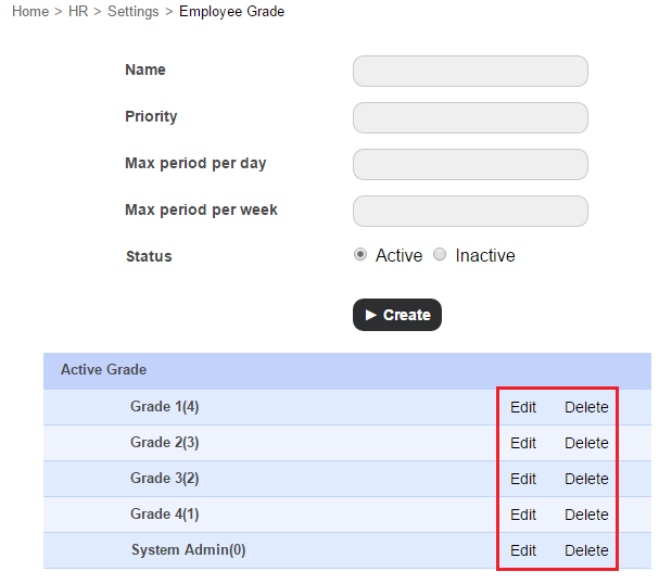 Click Edit beside the employee grade you want to edit, select the Inactive status, and then click the Update button. Employee grades that are inactivated are moved under the Inactive Grade list.