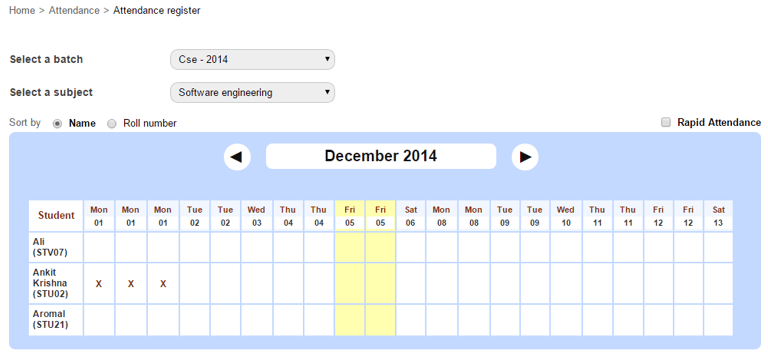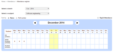 By default all students are considered present in Fedena. You will only need to mark attendance for students who are absent. Students can be marked absent only for the current date or a past date, students cannot be marked absent for a future date.