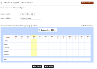 Click the module access icon > Academics > Attendance > Attendance register to open the Attendance register page