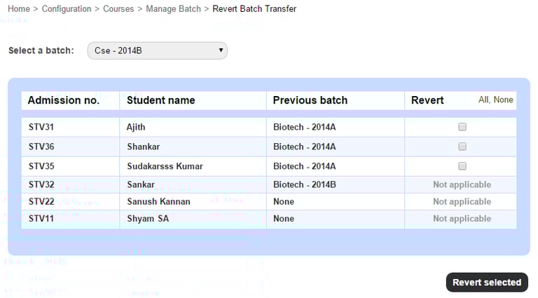 If you have accidentally transferred a student, you can revert the student back to the previous batch. You cannot revert a student if the student has been assigned a fee collection, assigned to subjects, has paid fees, has appeared for an exam in the current batch, or if there is no previous batch. Revert batch transfer can be performed by the administrator or a privileged employee (Manage Course/Batch privilege must be provided).