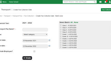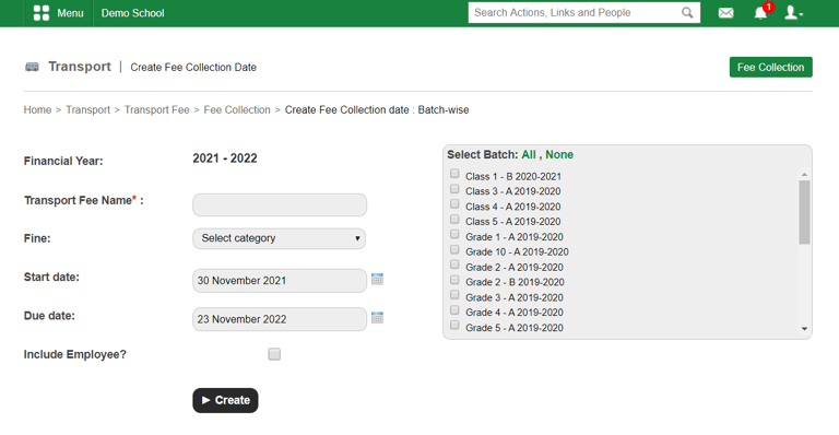 At the top of your dashboard, click on Menu > Administration > Transport > Transport Fee > Fee Collections > Batch-wise Fee Collections to open the Create Fee Collection date page.