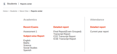 You can see a link called 'Report' if you click on the link it will take you to report page of the student as shown in the screenshot.