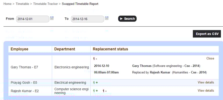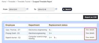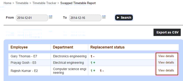 The Swapped Timetable Report will help you track the teachers who have been teaching extra classes, as well as teachers who have missed classes.
