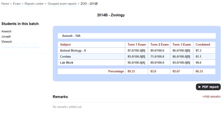 The Grouped Exam Report displays total percentage obtained by each student for all connected exams. At the top of your dashboard, click the module access icon > Academics > Examination > Reports center > Grouped Exam Report.