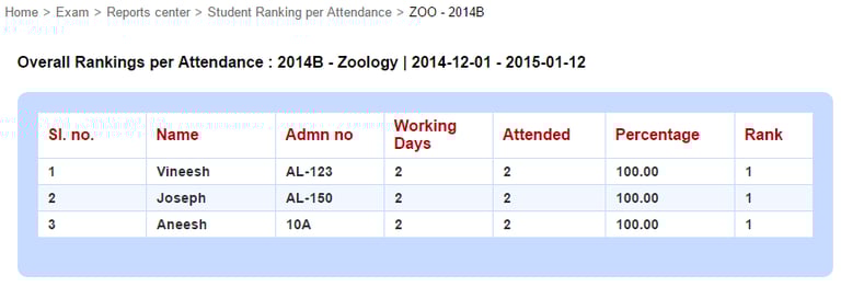 The Student Ranking per Attendance ranks students according to their attendance during a specific period. At the top of your dashboard, click the module access icon > Academics > Examination > Reports center > Student Ranking per Attendance.