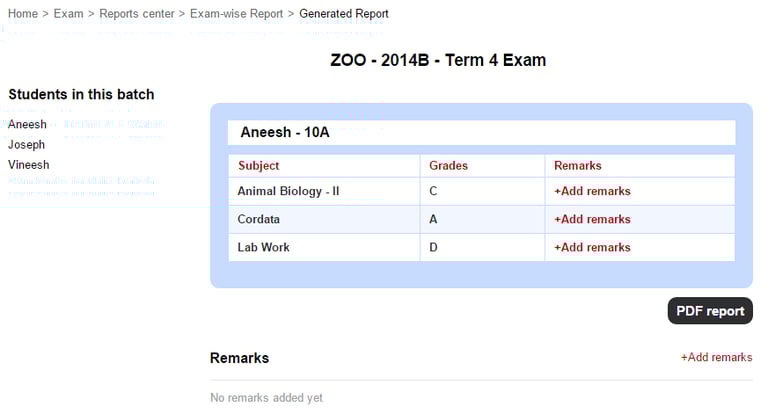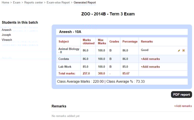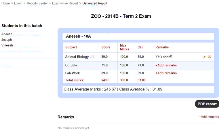 The students in the batch are listed on the left. Click on a student’s name to view the report. If you have selectedMarksas the exam type, the report would look like this.