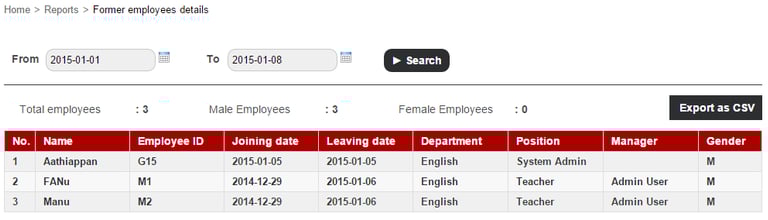The report lists all archived employees during the specified date range. The report includes each employee’s joining date, leaving date, department, employee position, manager, and gender.